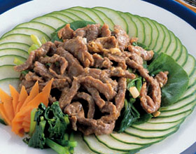 蚝油芥兰牛肉:'1.牛肉切片后加酱油、玉米粉、芡粉、油10克、清水50克拌匀,腌渍1.5小时,备用;2.芥兰切去头、尾、老茎、残叶部分,洗净备用;3.蒜头切碎;姜切末;...
