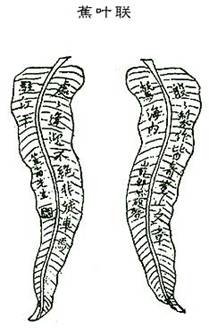 蕉叶题诗,韵事也;状蕉叶为联,其事更韵。但可置于平坦贴服之处,壁间门上皆可用之,以之悬柱则不宜,阔大难掩故也。其法先画蕉叶一张于纸于,授木工以板为之,一样二扇,一正一反,即不雷同。后付漆工,令其满灰密布,以防碎裂。漆成后,始书联句,并画筋纹。蕉色宜绿,筋色宜黑,字则宜填石黄,始觉陆离可爱,他色皆不称也。用石黄乳金更妙,全用金字则太俗矣。此匾悬之粉壁,其色更显,可称“雪里芭蕉”。