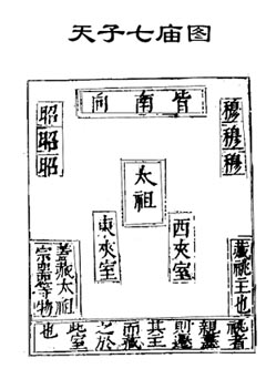 天子七庙,三昭三穆,与大祖之庙而七。此周制。七者,大祖及文王、武王之祧,与亲庙四。大祖,后稷。殷则六庙,契及汤与二昭二穆。夏则五庙,无大祖,禹与二昭二穆而巳。○祧,他彫反。契,息列反。诸侯五庙,二昭二穆,与大祖之庙而五。大祖,始封之君。王者之后,不为始封之君庙。大夫三庙,一昭一穆,与大祖之庙而三。太祖别子始爵者,《大传》曰“别子为祖”,谓此虽非别子,始爵者亦然。士一庙。谓诸侯之中士下士,名曰官师者。上士二庙。庶人祭於寝。寝,適寝也。適,丁历反。