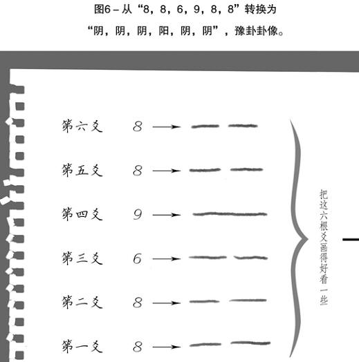 图6-从“8,9,9,7,7,6”转换为“阴,阳,阳,阳,阳,阴”,豫卦卦像。