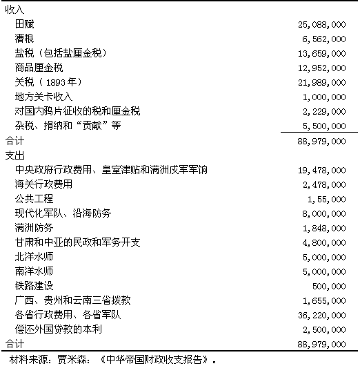 表二十一 十九世纪九十年代初期中央政府年收支的估算数(库平银)