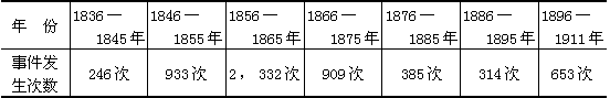 光绪和宣统时期当然没有发生可与太平军、捻军和回民起义相比的农民暴动。但是,这些规模空前的起义开始破坏了传统的农村社会,后来其他民众运动又继续加以破坏,不过影响的大小各有不同而已。在1840至1911年间,强弱程度不等的各种事件层出不穷。经历了1850年到1875年的高潮之后运动有所缓和,然后在十九世纪之末又勃发起来。杨庆堃曾对《大清历朝实录》记载的民众活动作过定量分析,[8] 其频繁程度有如下表:
