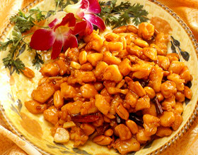 宫保鸡丁:'1.鸡去骨,切成1厘米见方的碎丁,用鸡蛋清、盐10克、生粉10克腌拌均匀。2.色拉油入锅烧热,鸡丁下锅炸熟,捞起沥油。3.锅中留油少许,香干辣椒段、蒜...    详细介绍