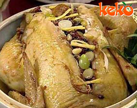 2.将以上几种辅料盛入盆内,加猪油60克、盐1.5克胡椒粉1克拌匀,装入鸡腹内,鸡颈开口处和肛门均用竹签封严,盛入盆内,上笼蒸2小时至九成烂,取出,沥干水,晾冷。用细竹签在鸡胸部、鸡乳腺部戳几个气眼。
