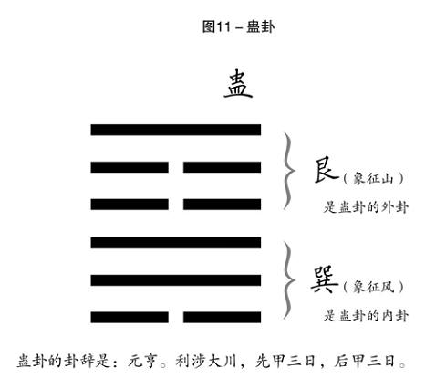 我们再往下看卜徒父的解释。他说:“《蛊》之贞,风也;其悔,山也。岁云秋矣,我落其实而取其材,所以克也。实落材亡,不败何待?”——前面讲过,八卦是三爻组成一卦,六十四卦是由八卦两两重叠而成的,也就是六爻组成一卦,它的下三爻叫做内卦,上三爻叫做外卦。蛊卦的内卦是八卦系统中的巽卦,外卦是八卦系统中的艮卦。卜徒父所谓的“《蛊》之贞”,说的就是蛊卦的内卦,也就是巽卦,他所谓的“其悔”,说的就是蛊卦的外卦,也就是艮卦。他这话也可以这么说:蛊卦的内卦是巽卦,蛊卦的外卦是艮卦。