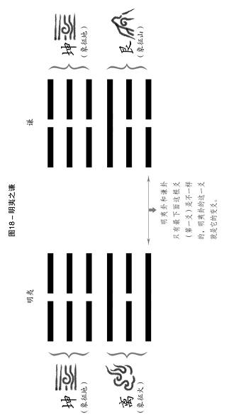 由此我们可以反推一下:在叔孙庄叔排演出明夷卦的时候,从第二爻到第五爻不是少阳就是少阴,只有第一爻的得数是9,所以是老阳。是老阳就要变身,于是明夷卦的第一爻从阳爻变成了阴爻,而其他五爻不变,这就构成了一个新卦——谦卦。