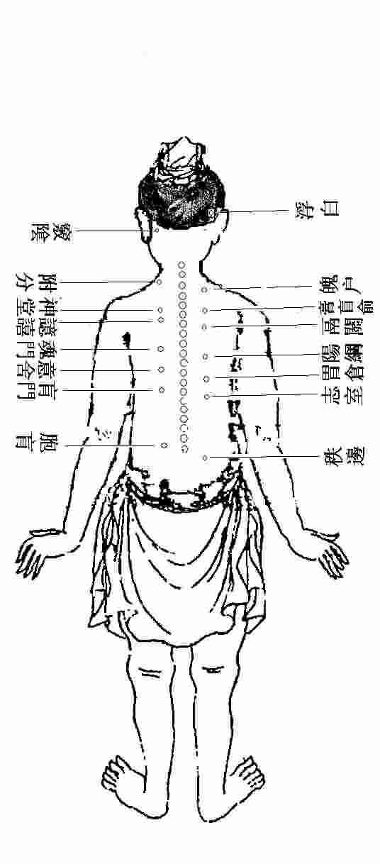 神堂二穴,在第五椎下,兩傍各三寸陷者中。正坐取之。足太陽脈氣所發。主肩痛,胷腹滿,反脊强急(按:似有缺、誤,不通)。灸五壯。針入三分。