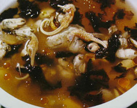 龙马童子鸡:'1.将公鸡宰杀后,去毛和内脏,洗净放入一个盆内;2.葱一半切段,一半切丝;姜切片,再取一半切丝;3.将海马和虾米用温水洗净,泡10分钟;4.海马、虾米...