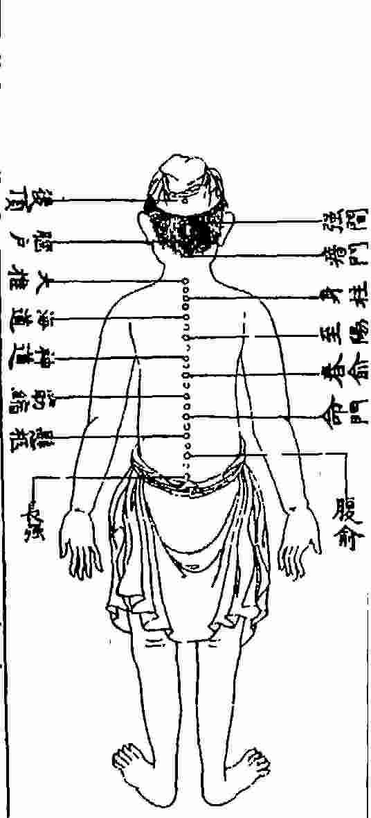 身柱一穴,在第三椎節下間。督脉氣所發。灸五壯。主癲疾,瘈瘲,怒欲殺人、身熱狂走、讝言見鬼。針入五分。